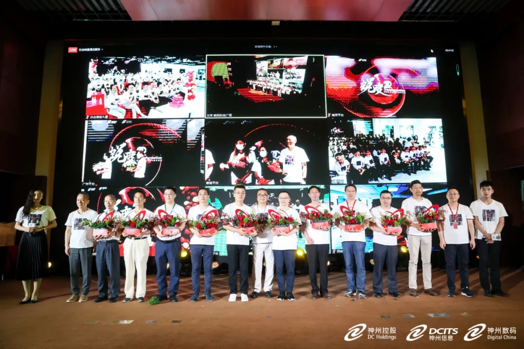 在二十年员工授勋环节,神州控股董事局副主席林杨、神州信息总裁李鸿春、米兰milan集团常务副总裁叶海强及其他分会场高管,分别为主会场及分会场20年员工代表授勋。